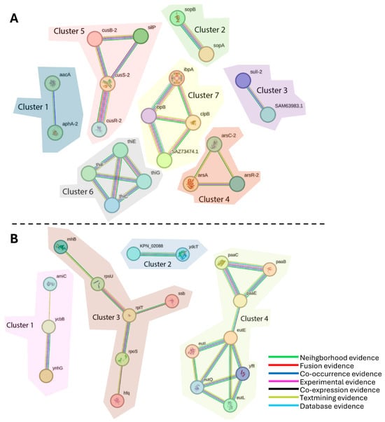 STRING analyses were also performed for the differentially expressed proteins at 1/4 MIC. There were seven clusters found related to proteins with lower abundance (Figure 4A and File S2) and four clusters related to proteins with higher abundance (Figure 4B). In the first case, cluster 1 and cluster 3 were directly linked with antimicrobial resistance (AMR): SAM63983.1 (cluster 3) which is involved in the response to antibiotics (streptomycin, spectinomycin) and refers to the protein encoded by ant(3″)-Ia (UniProt accession number Q7B8A0); while AphA-2 (cluster 1) is related to the response to aminoglycosides []. Moreover, the thiamine cluster (cluster 6) is related to virulence [] and in cluster 7, IbpA, and IbpB are related to stress response [].