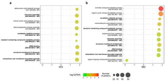 Bubble plot representation of the GO terms that were enriched in K. pneumoniae CCUG 70747 in (a) 1/8 MIC and (b) 1/4 MIC conditions. The color of the bubbles signifies statistical significance, whereas the size of the bubbles signifies the number of proteins having a specific GO term. In bold: GO terms enriched in both conditions. BP, Biological Process; MF, Molecular Function; CC, Cellular Component; FDR, false discovery rate; NES, normalized enrichment score.