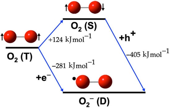 Figure 1 illustrates the calculated pathways for the formation of the •O2−(D) species. In this figure, blue arrows indicate the transformations between species. Singlet oxygen 1O2(S) is represented with a pair of electrons in opposite directions, triplet oxygen O2(T) with two unpaired electrons in the same direction, and doublet oxygen •O2−(D) is depicted with a black sphere, indicating its radical nature.