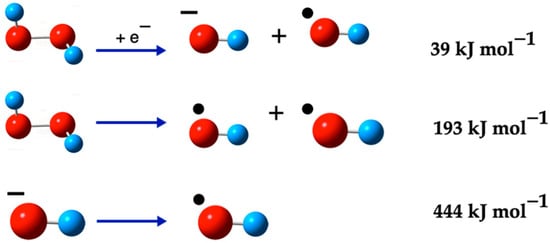 Particularly, the generation of •OH from H2O2 requires a relatively moderate energy input of 193 kJ mol−1. This energy requirement is significantly lower than the energy needed to form •OH from the hydroxide ion (OH−), which is about 444 kJ mol−1. However, when H2O2 undergoes reduction with an electron, the energy requirement is further reduced to 39 kJ mol−1, making it a more energetically favorable reaction for •OH formation [75]. Apart from these pathways, there exist other routes for generating •OH that require even less energy. However, these alternative pathways often result in the formation of the OH− ion as a byproduct [42]. This indicates a trade-off between the energy efficiency of the reaction and the purity of the •OH produced.
