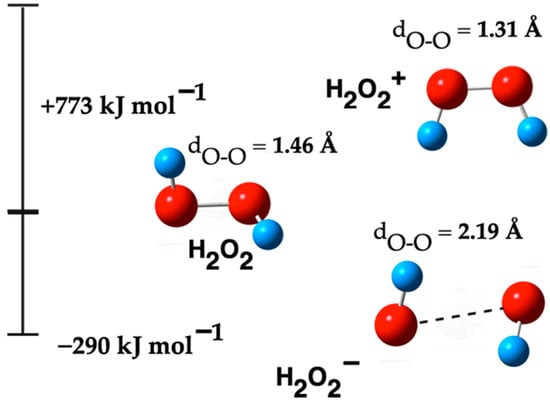 As shown in Figure 3, the cationic (H2O2+) and anionic (H2O2−) forms of hydrogen peroxide exhibit distinct molecular structures compared to the neutral H2O2 molecule. These structural variations arise mainly from the addition or removal of an electron in the H2O2 molecule. Thus, the alteration in the electrical charge significantly impacts the distribution of electronic density within the molecule, causing consequent changes in its molecular structure [81].