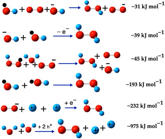Finally, throughout this work, reactions of ROS formation from various species have been described, as well as dissociation reactions of ROS to form other molecules. Both groups of reactions involve many species. It should not be forgotten that in a photocatalytic system, there are many highly reactive species, such as ROS and, with favorable conditions for high chemical activity, direct and reverse reactions should occur simultaneous, parallel and consecutively, forming multiple species, among others, short-life intermediates; in this scenario, it is very difficult to draw unequivocal conclusions. We summarize the results in Table 9 and Figure 7, highlighting that those reactions are more energetically favored and, therefore, the most probable ones to form the interesting ROS.