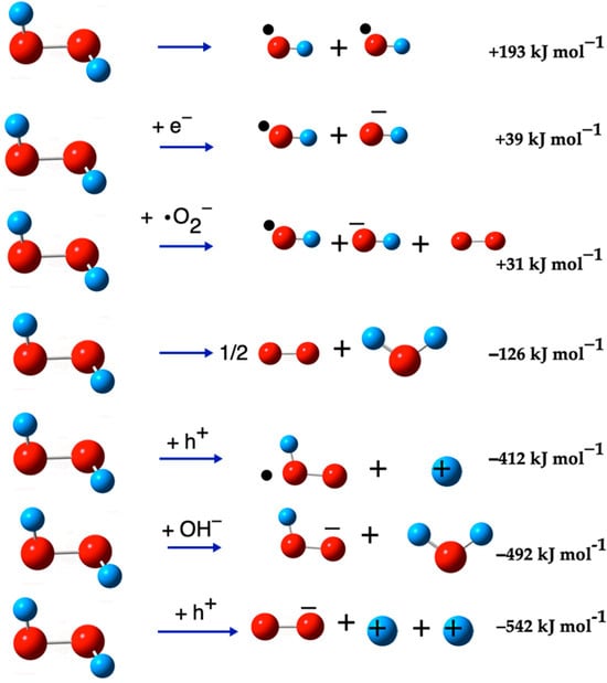 Some reports on the characterization of H2O2 species revealed that besides the neutral form (H2O2), it has anionic (H2O2−) and cationic (H2O2+) counterparts. The H2O2+ ion can be generated through the removal of an electron from a H2O2 molecule, effectively creating a positively charged species. Conversely, the H2O2− ion forms when a H2O2 molecule acquires an additional electron, resulting in a negatively charged species. These ionization processes can occur in high-energy environments, such as in photoelectron spectroscopy experiments, or in chemical reactions involving reactive species [79,80]. These forms, particularly H2O2− and H2O2+, although less explored but potentially play a significant role in photocatalytic reactions.