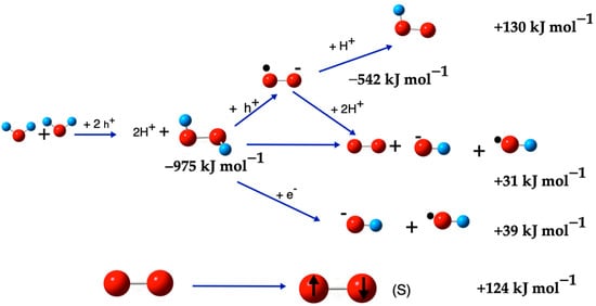 Figure 5 shows two pathways originating from the superoxide radical •O2− and require an acidic medium for them to take place. On the one hand, in the presence of an H+ ion, which can form spontaneously in an aqueous medium, the •O2− radical reacts with the H+ ion to form the intermediate species, •O2H (−45 kJ mol−1). This species then reacts with an H+ ion and with the superoxide •O2− present in the medium, to form O2(S) and H2O2 (43 kJ mol−1). On the other hand, the •O2− radical, two H+ ions, and one electron led to the spontaneous formation of H2O2 (−232 kJ mol−1).