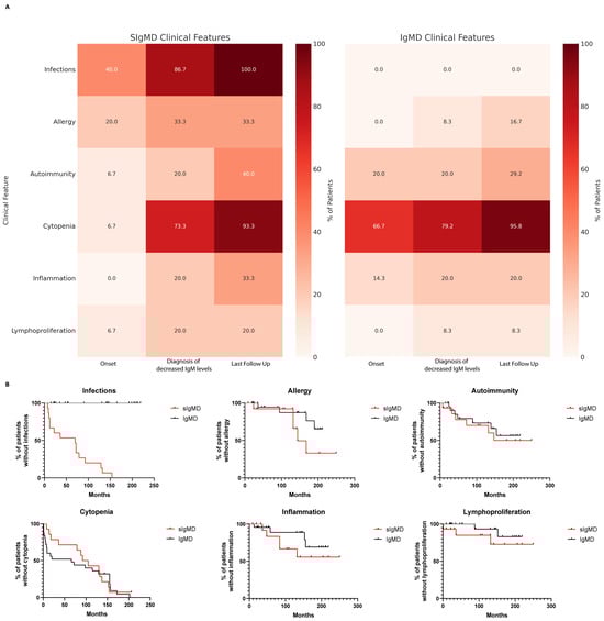 Comparison of clinical features in patients with selective IgM deficiency (sIgMD) and IgM deficiency without infections (IgMD). (A) Heatmap showing the distribution of major clinical features (infections, cytopenia, autoimmunity, allergy, inflammation, and lymphoproliferation) across timepoints (onset, diagnosis, and last follow-up) in sIgMD and IgMD patients. (B) Kaplan–Meier curves showing the cumulative incidence of clinical manifestations (autoimmunity, allergy, cytopenia, lymphoproliferation, and inflammation) over time in sIgMD and IgMD groups.
