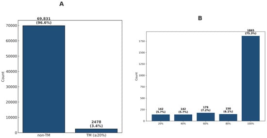 The distribution of GXXXG motifs in TM and non-TM regions. (A) The number of GXXXG motifs categorized as non-transmembrane (non-TM) and transmembrane (TM, with ≥20% coverage). (B) The proportion of TM motifs at various TM coverage thresholds (20%, 40%, 60%, 80%, and 100%). The group with 100% TM coverage is the most common among TM motifs, making up about 75% of TM-annotated motifs.