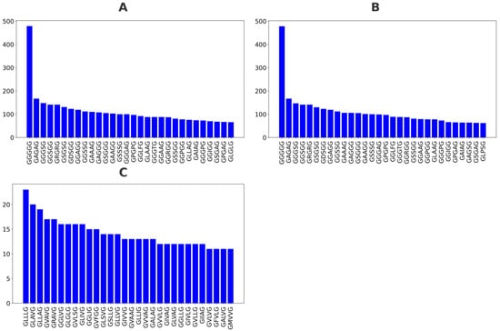 A total of 72,309 GXXXG motifs were obtained. Using the UniProt XML transmembrane annotation, the GXXXG motif dataset was further employed to determine whether they are located in the TM region. A total of 69,831 and 2478 GXXXG motifs were characterized into the non-TM and TM (with TM coverage ≥ 20%) annotations (Figure 1A), respectively. The top 30 GXXXG sequences by frequency for total, non-TM, and TM categories are depicted in Figure 2A, Figure 2B and Figure 2C, respectively.