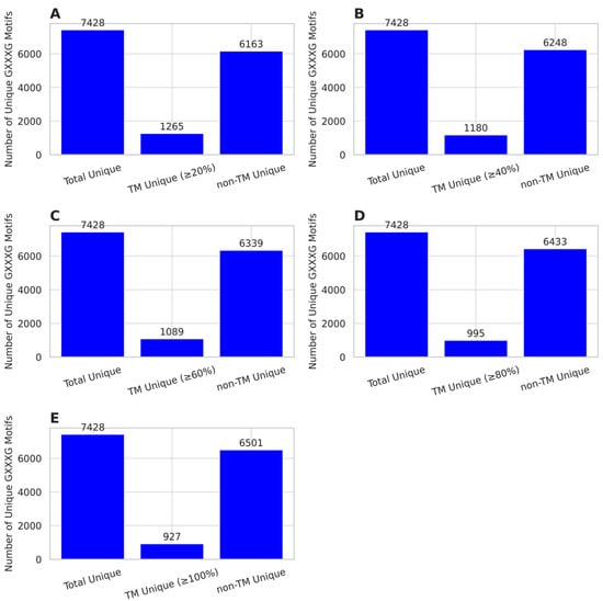 At TM coverage ≥ 20% (Figure 7A), the TM-only group contained only 41 unique GXXXG sequences, whereas the non-TM group exhibited 6286 unique motifs. Notably, 1101 motifs were found in both TM and non-TM sequences, suggesting a degree of conservation across membrane boundaries. As the TM coverage threshold increased, the number of TM-only motifs decreased steadily: 39 motifs at ≥40% (Figure 7B), 34 motifs at ≥60% (Figure 7C), 30 at ≥80% (Figure 7D), and just 28 at 100% TM coverage (Figure 7E). Conversely, non-TM unique motif counts increased slightly with higher TM stringency (ranging from 6286 to 6572), while shared motifs declined from 1101 to 828 as coverage thresholds increased.