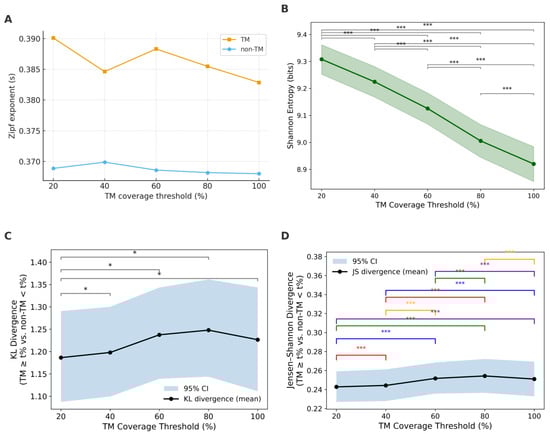 Summary of Zipf, entropy, and divergence metrics across TM coverage thresholds. (A) Zipf exponent for TM and non-TM motifs. (B) Shannon entropy values of motif distribution with 95% confidence (green shading area) in each category. (C) Kullback–Leibler divergence and (D) Jensen–Shannon divergence between TM percentages and non-TM distributions with 95% confidence (blue shading area). (* p < 0.05, *** p < 0.001).