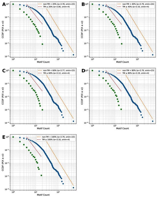 Figure 6A–E illustrate the complementary cumulative distribution functions (CCDFs) of motif counts on log–log axes, across TM coverage thresholds of ≥20%, 40%, 60%, 80%, and 100%. Each figure juxtaposes the empirical motif distribution with its corresponding power-law model, providing a straightforward visual comparison between TM and non-TM distributions at each threshold. In both TM and non-TM motifs, heavy tails are evident across all thresholds, indicating highly skewed frequency distributions where a few motifs are very prevalent, while the majority are rare. This trend matches the heavy-tailed patterns observed in the Zipf rank-frequency plots, reaffirming the consistency of this motif distribution pattern in both TM and non-TM data.