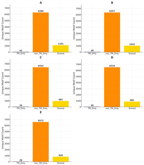At the TM ≥ 20% level, we identified 1265 unique motifs within TM regions, compared to 6248 unique motifs in non-TM sequences (Figure 3A). Increasing the TM threshold to ≥40% reduced the TM-unique motif count to 1180, a drop of 6.7% (Figure 3B). Further raising the threshold to ≥60% decreased the unique count to 1089 (Figure 3C), while TM ≥ 80% yielded only 995 unique motifs (Figure 3D). At the strictest cutoff (TM ≥ 100%), only 927 motifs remained TM-specific (Figure 3E).