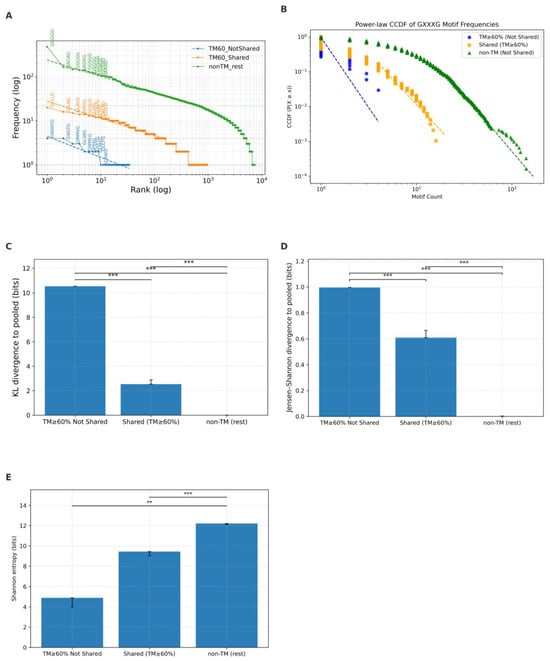 Statistical features of GXXXG motifs of TM-only, shared, and non-TM. (A) Zipf’s rank–frequency plot for TM-only, non-TM, and shared motifs at TM ≥ 60% with fitting curves (dashed lines). (B) Power-law CCDFs of motif counts across the three groups with fitting curves (dashed lines). (C) Kullback–Leibler divergence measurement. (D) Jensen–Shannon divergence calculation. (E) Shannon entropy values. Shared motifs show properties that are intermediate between TM-only and non-TM motifs. (** p < 0.01, *** p < 0.001).