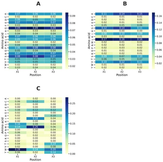 Amino acid composition of the X1, X2, and X3 positions in the GXXXG motif. Heatmaps illustrating log2 enrichment of amino acids: non-TM (A), shared (B), and shared TM (C). Hydrophobic and bulky residues (W, M, L, and I) are enriched in TM motifs, whereas flexible/polar/charged residues (G, S, E, and K) are predominant in non-TM motifs. Shared motifs show an intermediate amino acid composition.