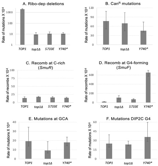 We further tested whether Top1Y740* mutant can affect genome instability at non-G4-forming sequences. The rate of canavanine resistant mutations, a generally used measure of mutability [], did not change with the null deletion of Top1 or with the expression of Top1Y740* (Figure 1). There was no change in the rates of mutation or recombination at highly transcribed mutation and recombination reporters pGAL-GCA and pTET-LYS2-SmuR with high GC contents [,]. In order to determine whether Top1Y740* affects genome instability at G4-forming sequences, we chose to employ two well-characterized reporter constructs previously used to study G4-induced recombination (pTET-LYS2SmuF) and deletions (pGAL-DIP2C) [,]. Both of these reporters contain inducible promoters to allow conditional induction of G4 DNA formation, the absence of tetrocycline for pTET and the presence of galactose for pGAL. Additionally, both of the reporters contain G4 motifs that were verified in vitro to form G4 structures [,]. Elevation in duplication mutations and recombination were noted at pGAL-DIP2C and pTET-LYS2SmuF reporters (Figure 1D,F), each with the insertions of G-run-containing sequences, indicating that the effect of Top1Y740* was specific to G4 DNA.