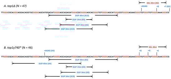 We next tested whether the expression of this G4-DNA-binding mutant Top1 affects deletion mutations occurring at a G4-forming sequence. We used yeast strains with a 130 bp fragment of human DIP2C gene, which was verified to form G4 conformation by circular dichroism analysis and primer extension assay, integrated into the yeast LYS2 locus []. At this reporter (pGAL-DIP2C), DIP2C sequence is highly transcribed from the galactose-inducible pGAL promoter when cultured in media containing 2% galactose. Williams et al. previously showed that deletions or duplications of >10 nt occur at these sequences with significantly higher frequency compared to a control construct containing a similar length of GCA repeats. First, deletion of TOP1 gene does not lead to a noticeable elevation in large duplications at DIP2C fragment or GCA repeats (Figure 1E,F). However, the expression of Top1Y740* in top1∆ strain led to a modest increase in overall mutation rate for the DIP2C-containing reporter (Figure 1F) and specifically an increase in duplications > 10 nt from 20.6 × 10−8 to 30.4 × 10−8 (Table 1). For both top1∆ and Top1Y740*-expressing cells, the duplications ranging from 19 to 49 nts in size occurred within the DIP2C insert and were flanked by microhomologies ranging from 5 to 11 nts (Figure 2 and Table S1). The elevation in the duplication events in DIP2C fragment in Top1Y740*-expressing cells was relatively small compared to the elevation in recombination rates at Sµ fragment, potentially indicating that the mechanism leading to the duplication events and the recombination events might be distinct.