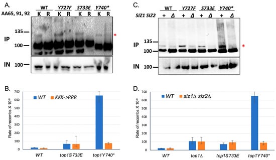 We previously showed that Wss1 protease can partly suppress the elevation in G4-associated recombination affected by Top1Y740* expression []. Since Wss1 is targeted to SUMO-modified proteins, we accordingly confirmed that wildtype as well as mutant Top1 proteins are modified by SUMOylation. To determine the effect of the post-translational modification, we introduced mutations to wildtype and mutant Top1 to abrogate SUMOylation. K103, K117, and K153 of human Top1 were identified as sites of SUMO ligation and mutations of these lysines were shown to abolish SUMOylation []. We mutated the three lysines at putative SUMOylation sites in yTOP1 (K65, k91, and K92) [] to arginine and confirmed the elimination of SUMOylation by SUMO pull-down (Table S2 and Figure 3A). For wildtype Top1 and Top1S733E, there was no change in the G4-associated recombination at the pTET-LYS2-SmuF reporter following KKK->RRR mutation. For Top1Y740*, the recombination rate was reduced by greater than 8-fold when SUMOylation was abolished (Figure 3B). We took a second independent approach to eliminate SUMOylation. Siz1 and its paralog Siz2 are E3 SUMO ligases responsible for the transfer of SUMO (Smt3) [] and Top1-SUMO conjugation is eliminated in a siz1∆ siz2∆ strain background []. As Figure 3C shows, the SUMOylation of wildtype, Top1S773E, or Top1Y740* were all significantly reduced in siz1∆ siz2∆ backgrounds. Similar to KKK->RRR mutation, the deletion of SIZ1 and SIZ2 resulted in significant changes to the rate of recombination at the pTET-LYS2-SmuF reporter only in the Top1Y740*-expressing cells. In cells with functioning SUMO ligases, the G4-associated recombination rate in Top1Y740*-expressing cells was about 6-fold higher than that in top1∆ background (Figure 3D). In siz1∆ siz2∆ backgrounds, however, the rate of recombination in Top1Y740*-expressing cells was reduced to be similar to those in top1∆ cells or Top1S733E-expressing cells. Overall, the drastic decreases in the rate of recombination at the pTET-LYS2-SmuF reporter observed upon disrupting SUMO ligases (siz1∆ siz2∆ background) or mutating the SUMO ligation sites on Top1Y740* (KKK->RRR) indicate that SUMOylation of Top1Y740* is an important component of the mechanism of genomic instability at G4-containing sequences induced by the cleavage-defective Top1 mutant.