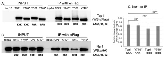 The effect of eliminating SUMOylation of Top1Y740* on Nsr1 interaction. Co-immunoprecipitation (co-IP) experiments conducted with whole-cell extracts from vtc4∆ yeast strains expressing Top1-3XFLAG and Nsr1-6XHA. αFLAG antibody-coated agarose beads were used in pull-down. (A,B) are from one of three independent experiments carried out. The blots from the other two experiments are in Figure S1. Blots were probed with either αFLAG (A) or αHA (B) antibodies. (C). ImageJ v1.51 was used for the quantification of bands. Error bars represent standard deviations calculated from three independent experiments carried out. p-values were calculated using Student t-test. NS *—0.90, NS **—0.82, and NS ***—0.39.
