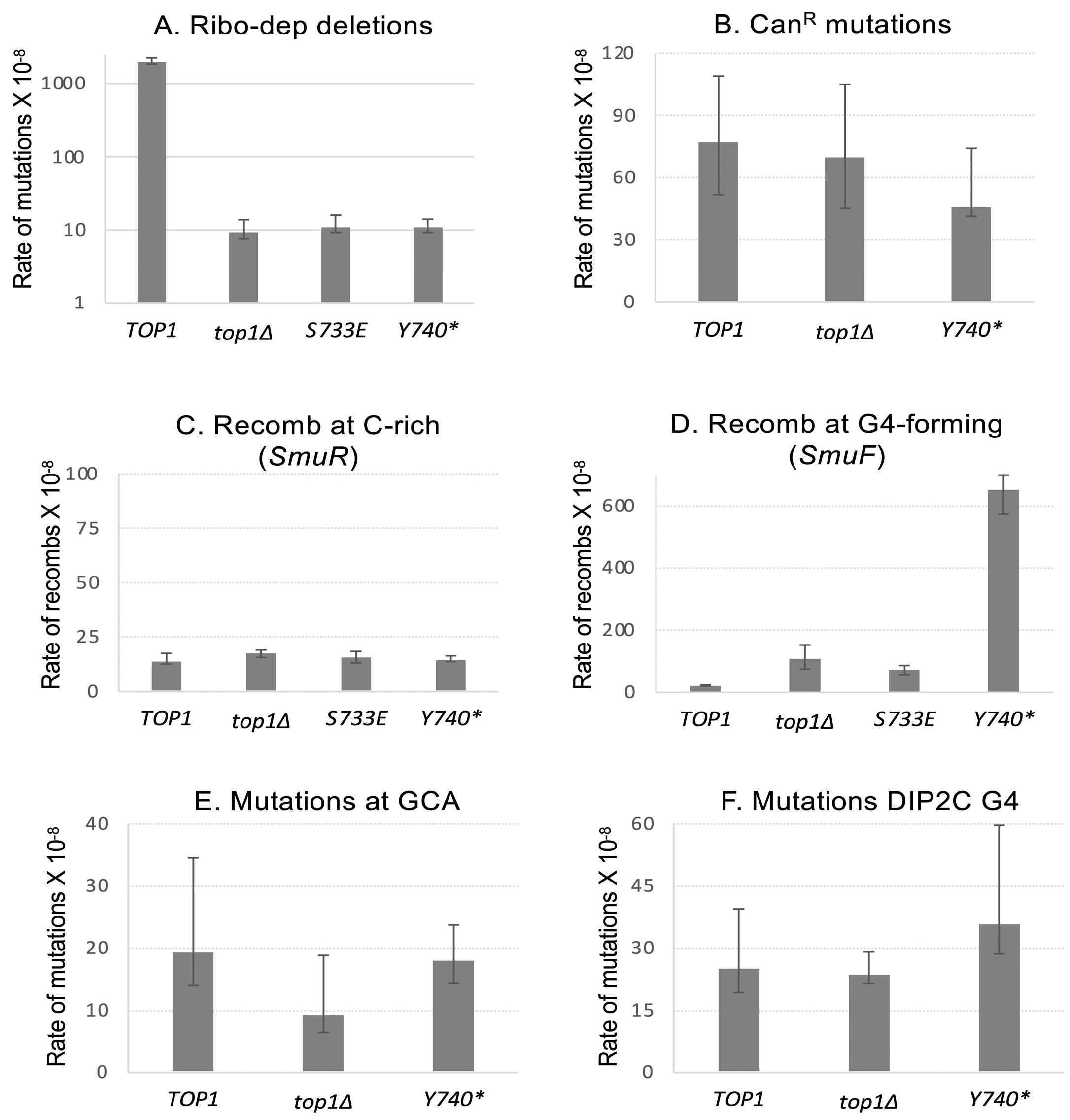 Figure 1. Rates of mutation and recombination in Top1Y740*-expressing cells. (A). The rates of deletion mutations at pTET-LYS2-AG4 reporter in rnh1∆ rnh201∆ backgrounds with the indicated Top1 alleles. (B). The rates of canavanine resistance mutations in the yeast strains with indicated Top1 alleles. (C). The rates of recombination at the pTET-LYS2-SmuR reporter with the C-run-containing strand in the non-transcribed strand orientation. (D). The rates of recombination at the pTET-LYS2-SmuF reporter with the G4-forming sequence in the non-transcribed strand orientation. (E). The rates of mutations at the GCA-repeat-containing reporter. (F). The rates of mutations at the pGAL-DIP2C reporter. (AF): Error bars indicate 95% confidence intervals).