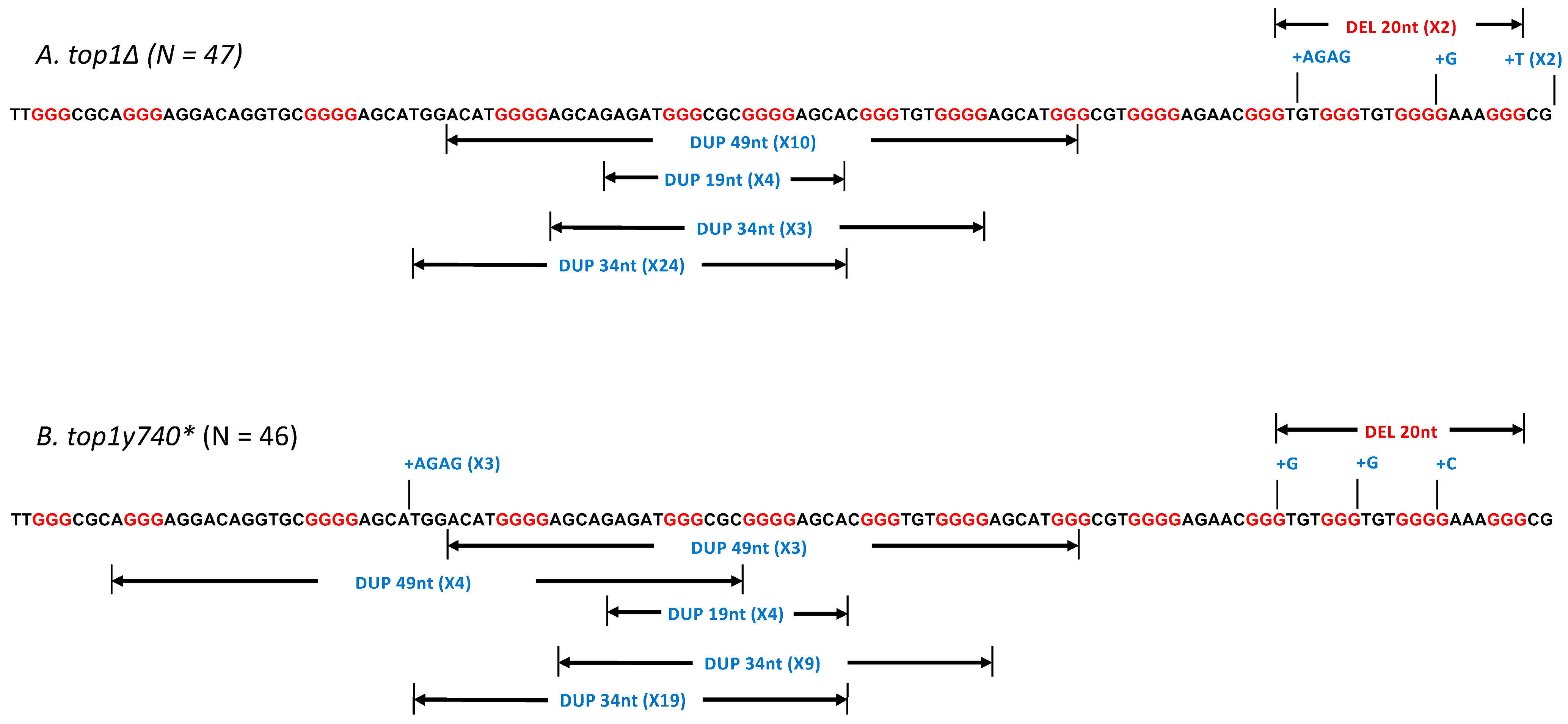 Figure 2. Mutation spectra at the pGAL-DIP2C reporter in top1∆ and Top1Y740*-expressing cells. The sequence of DIP2C inserted into the pGAL-DIP2C reporter is shown in bold with the guanine runs indicated in red. The spectrum of mutants sequenced are shown. The locations of duplicated and deleted sequences are marked by the arrows and insertion mutations are indicated with +. When the same mutant sequences are identified multiple times, they are indicated by the numbers in (). 47 (A) and 46 (B) mutants are sequenced from top1∆ and Top1Y740*-expressing strains, respectively.