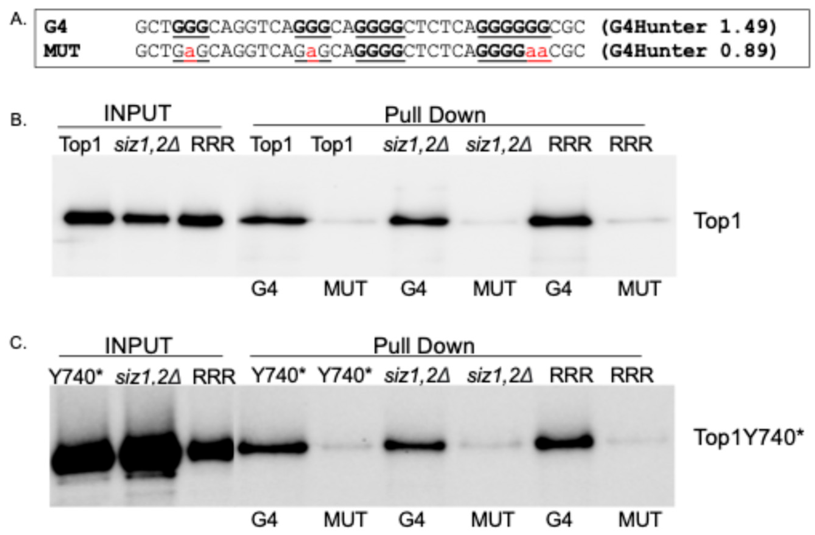 Figure 4. The effect of eliminating SUMOylation of Top1Y740* on G4 DNA binding. (A). The sequences and G4 Hunter scores for oligos used for the oligo pull-down assay. (B,C). Yeast whole-cell lysates from the indicated strains expressing WT or mutant Top1 proteins tagged with 3XFLAG were incubated with G4 or MUT biotinylated oligos and pulled down with streptavidin magnetic beads. Western blots of input and pull-down fractions were probed with an α-FLAG-HRP antibody (Sigma). Input and pull-down samples from wildtype Top1 in a SIZ1 SIZ2 background, wildtype Top1 in a siz1∆ siz2∆ background, and Top1K65R, K91R, K92R mutants in a SIZ1 SIZ2 background are shown in (B). Input and pull-down samples from Top1Y740* in a SIZ1 SIZ2 background, Top1Y740* in a siz1∆ siz2∆ background, and Top1Y740*, K65R, K91R, K92R mutants in a SIZ1 SIZ2 background are shown in (C).