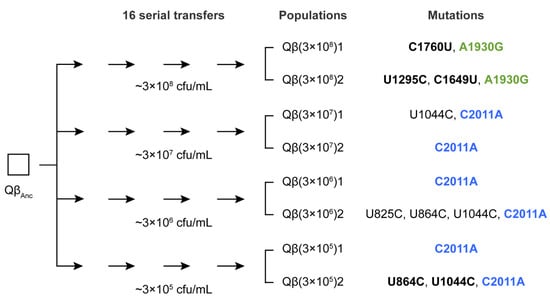 Scheme of the evolution experiment on which this study is based [28]. The ancestral virus QβAnc (obtained from a cDNA clone; see Section 4.1) was propagated for 16 serial transfers at the bacterial densities indicated. Evolutionary lineages obtained at transfer number 16 were denoted Qβ(3 × 108), Qβ(3 × 107), Qβ(3 × 106), and Qβ(3 × 105), indicating the bacterial density (expressed in cfu/mL and shown in brackets). Two replicates were performed for each condition. The mutations that appear in the consensus sequence of each line are shown on the right. A1930G and C2011A are highlighted in green and blue, respectively. Fixed mutations are shown in bold.