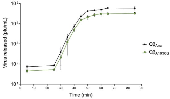 To determine the latent period of QβA1930G relative to the wild-type virus (represented by QβAnc, as indicated in Section 4), we performed one-step growth curves (Figure 2). Both viruses exhibited a latent period of 25 min, which is comparable to the 30-min latent period previously reported for QβC2011A and QβAnc [28]. It is important to note that virus–host contact was limited to five minutes in this experiment to minimize differences in adsorption efficiency. Minor differences between assays may also arise from variations in bacterial physiological state, culture media batches, or subtle, hard-to-control laboratory conditions.