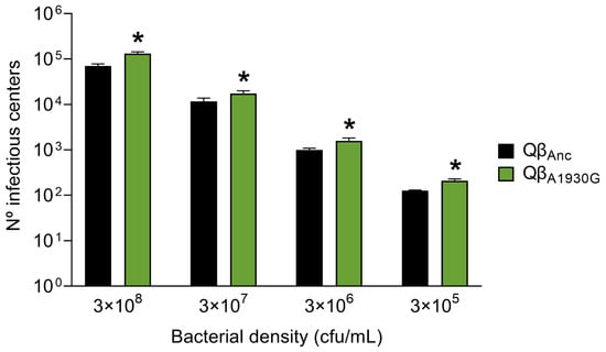 Number of infectious centers produced by QβAnc and QβA1930G. A total of 105 pfu of either QβAnc (black bars) or QβA1930G (green bars) were incubated for 10 min with the bacteria concentrations indicated below the figure (3 × 108, 3 × 107, 3 × 106, and 3 × 105 cfu/mL). After this time, the samples were processed as indicated in Section 4.2 of Section 4. Each bar represents the average of three determinations. Asterisks indicate statistically significant differences from QβAnc (p < 0.05, Welch test with Benjamini–Hochberg correction for multiple comparisons).