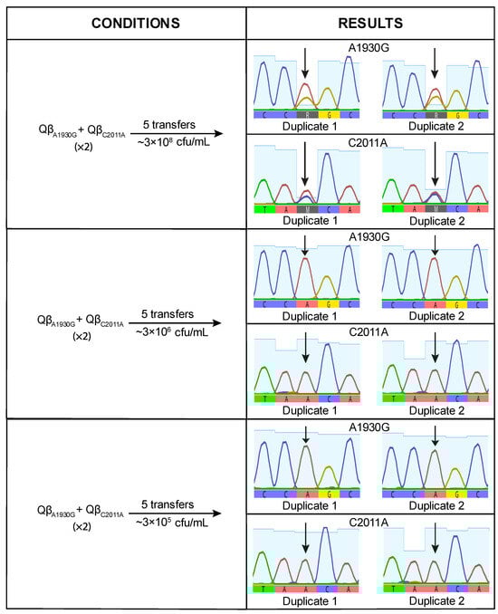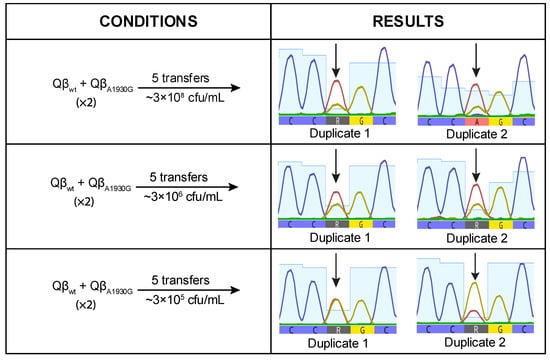 To investigate whether, despite having a burst size value lower than that of QβAnc, QβA1930G has a selective advantage on its own, we performed a competition experiment between both viruses. Equal amounts of each virus were used to initiate the infection, and the resulting progeny was propagated through five serial transfers. The experiment was conducted in duplicate at three bacterial concentrations: 3 × 108 cfu/mL, 3 × 106 cfu/mL, and 3 × 105 cfu/mL. At the final transfer, we analyzed position 1930 of the viral genome to determine whether the mutation had become dominant or not (Figure 4).