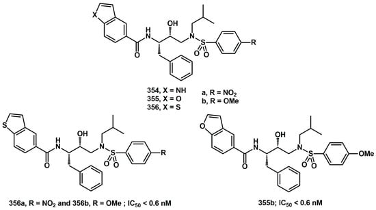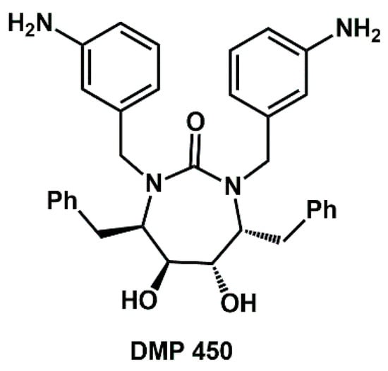 Although no new protease inhibitors have been approved or used in a clinical trial since 2007 [], many small molecules have been described in the last fifteen years, with the aim of targeting the protein backbone. The goal has been to maximize interactions with enzyme backbone atoms [,]. Both extensive hydrogen bonding and hydrophobic interactions with enzyme subsites can limit drug resistance, as the geometry of the catalytic site must be conserved to maintain functionality [,,]. In particular, the introduction of heterocyclic fragments has improved the activity of newly designed molecules, resulting in many potent inhibitors, as illustrated by FDA-approved darunavir and related compounds []. The introduction of cyclic scaffolds in the design of new chemical entities reduces flexibility and affords more rigid inhibitors. In particular, a cyclic scaffold can be envisaged as having either key interactions with catalytic aspartic acids or with residues belonging to the flap region of the active site []. The deep interest in cyclic chemotypes has been motivated by the different types of interactions formed with the enzyme while maintaining a key structural resemblance to a peptide substrate, to improve this profile for multidrug-resistant strains.