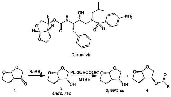 Fused bicyclic bis-tetrahydrofuran (bis-THF) is critical for darunavir’s durable drug resistance profile. Due to its challenging double-ring structure with three chiral centers, many different synthetic approaches have been developed according to the source of the chiral carbons in bis-THF alcohol 2 (Scheme 1) []. In this respect, enzyme-catalyzed resolution has been exploited by Khmelnitsky [], who described the simple and efficient kinetic resolution of the racemic alcohol 2 using immobilized lipase to afford the desired optically pure (R)-bis-tetrahydrofuran (bis-THF) alcohol 3. The reaction solvent, acyl donor, and immobilized biocatalyst proved to be critical factors.