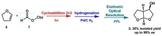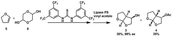 The organocatalytic condensation of 1,2-dihydrofuran 5 (Scheme 2) with glycolaldehyde catalyzed by Schreiner’s thiourea, coupled with enzymatic (Lipase PS) resolution, was described as a one-pot procedure by Itoh for the preparation of enantiopure 3 and applied to the environmentally friendly synthesis of darunavir [].