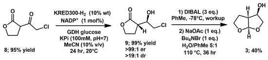 In 2020, Ghosh used the kinetic resolution of bis-THF alcohol by lipase (PS-30), in a late stage of the study as an alternative stereoselective approach to cis and trans 2,3-disubstituted tetrahydrofuran derivatives []. More recently, Hyster proposed a different chemoenzymatic approach to the use of bis-THF alcohol []. β-Ketolactone 8 was easily prepared and subjected to enantio- and diastereoselective dynamic kinetic resolution using suitable ketoreductase (KRED) and glutamate dehydrogenase (GDH) in phosphate buffer (KPi) from metagenomic mining (Scheme 4). Subsequent lactone reduction with diisobutylaluminum hydride and phase-transfer cyclization afforded the desired fragment 3 in an acceptable yield.