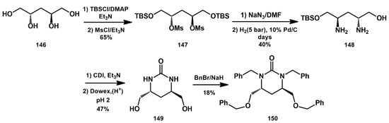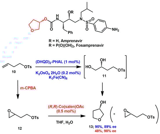 Asymmetric catalysis was also exploited in the last period. Sudalai [] proposed an efficient synthesis of (S)-tetrahydrofuran-3-ol 13, which is a critical fragment in amprenavir and fosamprenavir.