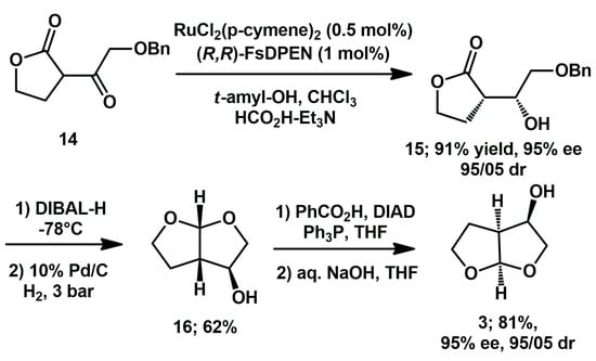 More and Ramana [] described a Ru-catalyzed enantio- and diastereoselective dynamic kinetic resolution of benzyloxy/benzoyloxy-α-acyl-γ-butyrolactones via transfer hydrogenation, achieved through the in situ prepared (R,R)-Ru-FsDPEN catalyst. Starting from benzyloxy butyrolactone 14, (3R,3aS,6aR)-hexahydrofuro[2,3–b]furan-3-ol 3 was prepared in good yield, with high de and ee through elaboration of the key intermediate (Scheme 6).