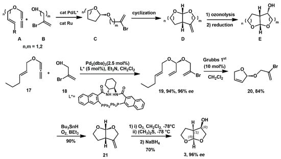 Pd-catalyzed asymmetric hydroalkoxylation of ene-alkoxyallene, followed by ring-closing metathesis (RCM), was successfully employed by Rhee [] for the preparation of hexahydrofurofuran-3-ol of type E, and was generalized to provide access to pyranofuranol and furopyranol derivatives in good yields and ee (Scheme 7). For the synthesis of 3, readily available allene 17 was coupled with commercial 2-bromo allylic alcohol 18 in the presence of Pd2(dba)3 as the palladium source and suitable ligand, affording the chiral adduct 19 in high yield and enantiomeric excess. Subsequent RCM provided the cyclic acetal 20, which underwent a radical, mediated 5-exo cyclization to intermediate 21, promoted by Bu3SnH in the presence of Et3B. Ozonolysis of this compound, followed by final reduction with NaBH4, furnished the target alcohol 3 in high yield with complete diastereoselectivity and no erosion of enantiopurity.