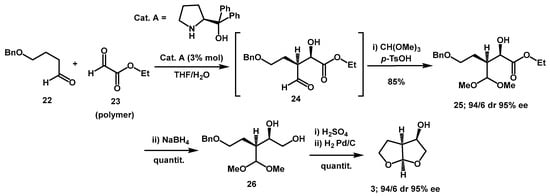 Organocatalytic methods were also successfully used. Ikemoto described an efficient synthesis of bis-THF alcohol 3 and its carbonyloxy-pyrrolidine-2,5-dione derivative taking advantage of diphenylprolinol-catalyzed enantio- and diastereoselective cross aldol reaction of polymeric ethyl glyoxylate 23 with the aldehyde 22 as the key step (Scheme 8) []. Optimization of the reaction involved stirring polymeric ethyl glyoxylate in toluene solution with water prior to aldol reaction for an appropriate period. This pre-treatment was highly effective in accelerating the reaction when using 3 mol % of catalyst A. It also ensured excellent reproducibility, even when polymeric ethyl glyoxylate from different manufacturers was utilized. The aldehyde of intermediate 24 was then protected as dimethyl acetal and the ester was reduced, yielding diol 26 in an overall yield of 85%. An acetal exchange reaction catalyzed by H2SO4 followed by hydrogenation with Pd/C catalyst afforded 3 in quantitative yield over two steps. Shortly thereafter, the same group described a series of amino perfluoroalkanesulfonamide derivatives of diarylprolinols, which proved to be effective organocatalysts [].