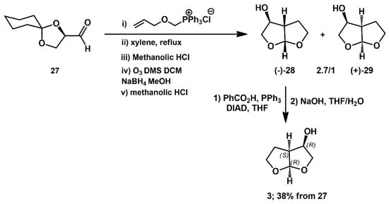 Traditional chiral-substrate approaches have also been employed over the past fifteen years. A spirocyclic dioxolane derivative from D-glyceraldehyde 27 was used by Kulkarni as starting chiral substrate for the preparation of all four isomers of bis-tetrahydrofuran alcohol in good overall yield (38%) of the active isomer 3 (Scheme 9) [].