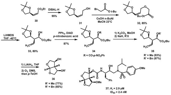 Synthesis of bis-THF ligands 36 from (S)-glyceraldehyde derivative 30.