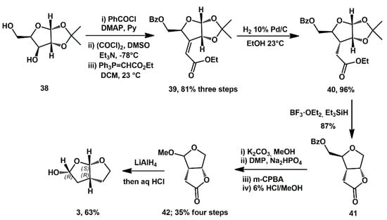 More recently, Ghosh described a new approach to bis-THF alcohol 3, starting from commercially available sugar derivatives []. As an example, commercial 1,2-O-isopropylidene-α-D-xylofuranose 38 was converted to α,β-unsaturated ester 39, by sequential selective protection of primary alcohol, Swern oxidation, and Wittig olefination (Scheme 11). Ester 39 was then submitted to highly stereoselective substrate-controlled catalytic hydrogenation, which represented one of the key steps.