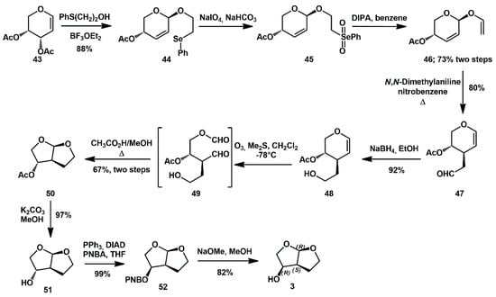 Regarding sugars as chiral pool materials, Sridhar developed a stereoselective synthesis of carbohydrate-derived perhydrofuro[2,3-b]furan derivatives, starting from sugar-derived allyl vinyl ethers []. In particular, bis-THF alcohol 3 was prepared using 3,4-di-O-acetyl-D-arabinal 43 as the chiral starting material (Scheme 12). It was first subjected to Ferrier rearrangement with 2-(phenylselenyl)ethanol, which provided 2,3-unsaturated glycoside 44. After oxidation to selenone 45, a base-mediated thermal fragmentation furnished the allyl vinyl ether 46, which underwent a Claisen []-sigmatropic rearrangement, affording the expected 3-C branched derivative 47. Reduction of the aldehyde, followed by ozonolysis of the olefin and acid-mediated acetalization, provided perhydrofuro[2,3-b]furan 50 in good yield. The synthesis of bis-THF alcohol 3 required deprotection of the ester, Mitsunobu inversion with p-nitrobenzoic acid in PPh3/DIAD system, and final hydrolysis.