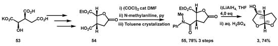 The potassium isocitrate, obtained from high-yielding fermentation fed by sunflower oil, was the starting material for the preparation of bis-THF alcohol 3 in the work of Yue (Scheme 13) []. After several steps, it was transformed into a tertiary amide, which was reduced along with the ester functionalities to a transient aminal-triol. This latter was converted in situ to the desired bis-THF alcohol. Each step was optimized, resulting in the key alcohol (in the form of activated carbonate) with an overall yield of 43%. Considering the low cost of the starting material and the efficiency of the overall synthesis, the method appeared to be effective in reducing the cost of darunavir.