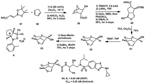 With the aim of creating a new class of inhibitors with improved pharmacological and drug-resistance profiles, Ghosh described the synthesis of a 6–5–5 ring-fused crown-like tetrahydropyranofurans and their incorporation into new potent inhibitors [,]. The synthesis started with an asymmetric Diels–Alder reaction between 57 and cyclopentadiene, using a chiral oxazaborolidinium cation A, as a key step (Scheme 14). The cycloadduct was oxidized with H2O2 to afford alcohol 59 in 80% yield over two steps, with 98% ee. After protection as the TBS ether, the intermediate was converted to bicyclic acetal 60 in three-steps, involving reduction with LiAlH4, one-pot oxidative cleavage of the olefin, and reduction of the resulting aldehyde with DIBAL-H. The lactol 60 (a 2:1 mixture) was treated with trifluoroacetic acid (TFA) to produce the bridged tricyclic derivative 61, and the TBS group was removed with tetrabutylammonium fluoride (TBAF), yielding the desired exo-alcohol. This compound was alternatively epimerized by Dess–Martin oxidation followed by reduction of the resulting ketone with NaBH4. The inhibitor 64 displayed superior antiviral activity and drug-resistance profiles compared to darunavir.