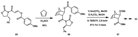 Alternatively, the Diels–Alder reaction of cyclopentadiene with chiral 3-(acyloxy)acryloyloxazolidinone derivatives was later used for the synthesis of 6-5-5 fused crown-like THF ligands (Scheme 15). In particular, 3-(4-methoxybenzoyl)acryloyl oxazolidinone derivative 65 and cyclopentadiene afforded the endo-diastereoselective derivative 66 in 98% yield. Reaction of the cycloadduct in MeOH provided the corresponding methyl ester 67 in excellent yield, which was a key intermediate in the synthesis of the bicyclic alcohol 63 [].