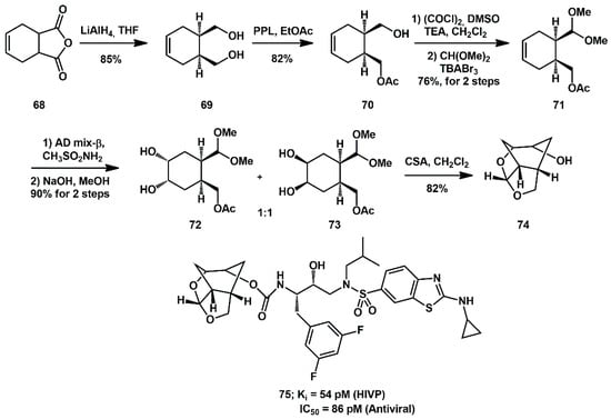 An optically active (1R, 3aS, 5R, 6S, 7aR)-octahydro-1,6-epoxy-isobenzo-furan-5-ol derivative was recently described as a high affinity ligand for HIV-1 protease inhibitors []. The stereoselective synthesis was based on enantioselective enzymatic desymmetrization of meso-1,2(dihydroxy methyl)cyclohex-4-ene 69 using porcine pancreatic lipase (PPL) to produce optically active alcohol 70 (Scheme 16) []. It was then converted to a functionalized cyclohexene derivative 71, which underwent Sharpless asymmetric dihydroxylation to yield a 1:1 mixture of diastereomeric diols 72 and 73. The diols were separated and only diastereomer 73 was utilized for the synthesis of ligand alcohol 74. In general, inhibitors bearing such ligands showed very potent activity. Moreover, compound 75, with a difluorophenylmethyl P1 ligand and an aminobenzothiazole as the P2′ ligand, maintained high potency against a panel of highly multidrug-resistant HIV-1 variants.