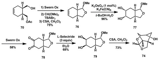 Synthesis of (1R, 3aS, 5R, 6S, 7aR)-octahydro-1,6-epoxy-isobenzo-furan-5-ol 74 via methyl acetal 76.