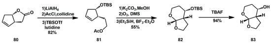 The synthesis of enantiomerically pure (3aS,4S,7aR)-hexahydro-2H-furo[2,3-b]pyran-4-ol 83 was originally described by Ghosh [] starting from known enantiomerically pure lactone 80 (Scheme 18). Subsequent steps involved reduction, selective protection/deprotection, ozonolysis, and reduction of the hemiacetal moiety. Final removal of the silyl group with TBAF furnished the desired ligand.