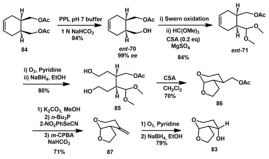 A more recent alternative route has been proposed, starting from inexpensive materials and taking advantage of highly enantioselective enzymatic desymmetrization of a meso-diacetate, already developed by the same group []. The enzymatic desymmetrization of 84 was optimized by using aqueous 1 N NaHCO3 for neutralization of acetic acid formed during the reaction (Scheme 19). Swern oxidation followed by protection of the aldehyde furnished the corresponding acetal ent-71. Oxidative cleavage of the olefin by ozonolysis in the presence of pyridine as the organocatalyst, followed by reduction of the resulting dialdehyde with sodium borohydride afforded diol 85. Treatment of the diol with a catalytic amount of CSA furnished bicyclic acetal 86 in 56% yield over 3 steps. After hydrolysis of acetate, the corresponding alcohol was treated with o-nitrophenylselenonitrile and n-tributylphosphine to give the corresponding selenide derivative. Oxidation of the resulting selenide with m-CPBA resulted in elimination of the corresponding selenoxide to afford olefin 87 in 71% yield over 3 steps. Ozonolysis of exo-olefin followed by reduction of the corresponding ketone yielded alcohol 83 in good yield.