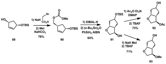 Various C3-functionalized cyclopentanyltetrahydrofurans (Cp-THF) were prepared and combined with hydroxyethylsulfonamide isosteres to obtain new inhibitors with high antiviral activity, including against a panel of multidrug-resistant HIV-1 variants []. As an example, 3-(R)-acetoxy and 3-(R)-methoxy ligands 92 and 93 were prepared from the known alcohol 89, which was first alkylated to provide methyl ester 90 (Scheme 20). DIBAL-H reduction followed by radical cyclization provided 3-(R)-hydroxy derivative 91 in 10:1 diastereomeric ratio. The major isomer was transformed into the desired ligand 92 by acetylation, followed by removal of the silyl group, in 73% yield over two steps. Alternatively, the methoxy derivative 93 was prepared by methylation followed by removal of silyl group, in 71% yield.