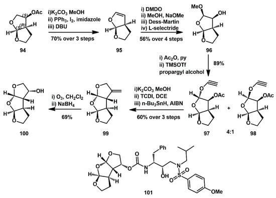 Novel oxatricyclic ligands were designed and synthesized by Ghosh to enhance interactions with the protease backbone []. In particular, the inhibitor 101, bearing the tris-THF syn-anti-syn configuration, showed very high activity against a variety of multidrug resistant HIV-1 variants and blocked HIV-protease dimerization about 10-fold better than darunavir (Scheme 21) []. Starting from the known acetate 94, the bicyclic enol-ether 95 was easily obtained. Subsequently, after epoxidation with dimethyldioxirane (DMDO) and regio- and stereoselective oxiranyl ring opening with sodium methoxide, the desired endo-alcohol 96 was obtained by Dess–Martin oxidation followed by L-selectride reduction of the resulting ketone. Acylation of 96, followed by treatment with propargyl alcohol, afforded acetals 97 and 98 in a 1:4 ratio. After removal of the acetate, the major diastereomeric alcohol deriving from 97 was converted into the corresponding tricyclic olefin 99. Ozonolysis followed by reduction furnished syn-anti-syn type oxatricyclic tris-THF 100 as a single isomer.