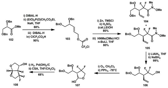 Gem-difluoro-bis-THF ligands were prepared and converted into suitable inhibitors, which exhibited very high activity and better lipophilicity profiles than darunavir, along with significantly improved blood–brain barrier permeability in an in vitro model []. The synthesis began with DIBAL-H reduction of optically active methyl ester 102 (Scheme 22), producing dibenzyl-L-glyceraldehyde. This intermediate underwent the Horner–Emmons reaction with sodium hydride and triethyl phosphonoacetate, affording the corresponding α,β-unsaturated ester in 88% yield over two steps. Reduction with DIBAL-H provided the corresponding allylic alcohol, which was treated with chlorodifluoroacetic acid in chloroform at reflux, yielding difluoroacetate derivative 103 in 90% yield over two steps. Subsequently, it underwent a Reformatskii–Claisen reaction by treatment with trimethylsilyl chloride and activated zinc dust. The subsequent acid-catalyzed esterification furnished a 2:1 mixture of diastereomers in 80% yield over two steps. The mixture could be separated after its conversion into the Weinreb amides, by treatment with HN(Me)OMe·HCl and n-BuLi. These amide diastereomers were separated by silica gel chromatography, providing the syn diastereomer 104 as the major product and the anti diastereomer 105 as the minor product, in a 2:1 ratio and with an overall yield of 80%.